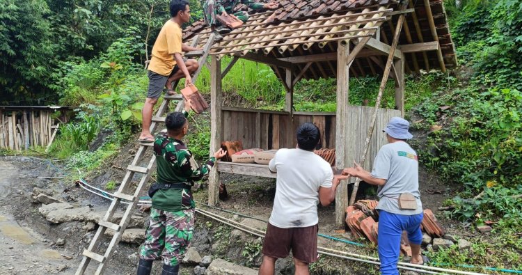 Dengan semangat gotong royong, prajurit TNI dan warga desa bahu-membahu membersihkan lumut yang menempel di atap genteng serta mengecat ulang dinding Poskamling. Suasana kebersamaan begitu terasa, mencerminkan nilai persatuan yang menjadi kekuatan utama masyarakat desa.